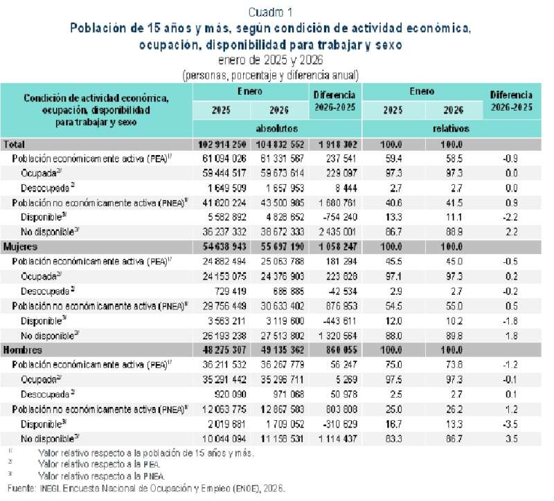 La población no económicamente activa (pnea) fue de 43.5 millones de personas[4] (41.5 % de la población de 15 años y más): creció en 1.7 millones de personas respecto a enero de 2025.
