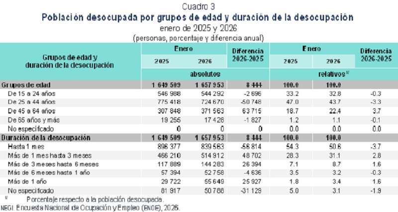En el mes de referencia, la población desocupada fue de 1.7 millones de personas, es decir, un ascenso anual de 8 mil. La desocupación de mujeres se ubicó en 687 mil, descendió en 43 mil respecto a enero del año anterior; la de hombres se situó en 971 mil, subió en 51 mil frente al primer mes de 2025.