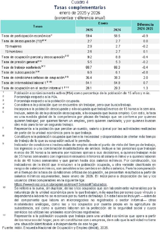 La tasa de condiciones críticas de ocupación —a partir de salarios mínimos equivalentes, base enero de 2026— fue de 38.3 por ciento. En enero de 2025, fue de 36.4 por ciento.