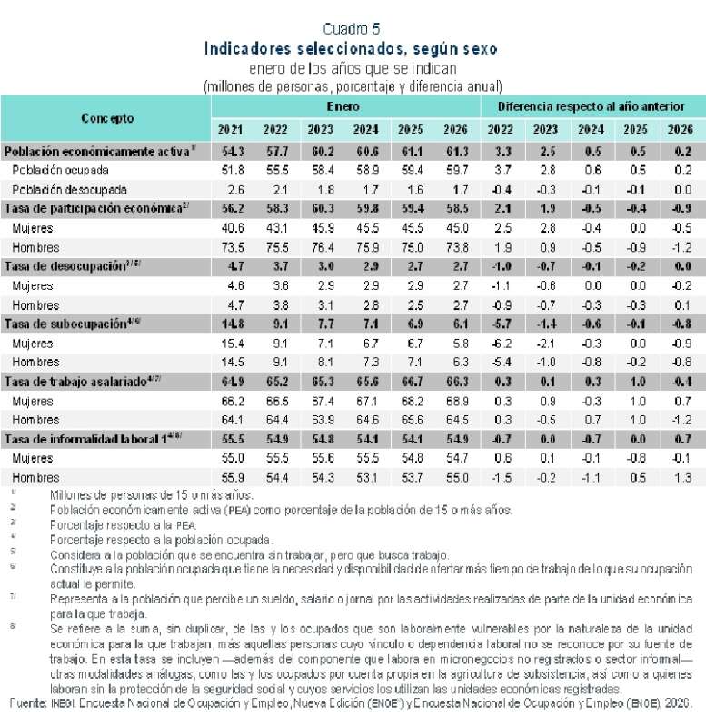 La información de la enoe, para enero de 2026, muestra que la población subocupada (personas que declararon tener necesidad y disponibilidad para trabajar más horas de lo que su ocupación actual les demanda) fue de 3.6 millones de personas, 481 mil menos respecto a enero de 2025. La tasa de subocupación se ubicó en 6.1 % de la población ocupada, porcentaje inferior al 6.9 % registrado en el primer mes de 2025. Según sexo, la tasa correspondiente en las mujeres fue de 5.8 % y en los hombres, de 6.3 por ciento.